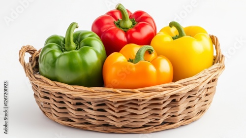Fresh Bell Peppers and Tomatoes in a Woven Basket on a White Background