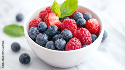 Fresh berries in bowl, including strawberries, blueberries, and raspberries, garnished with mint leaves, evoke sense of health and vitality
