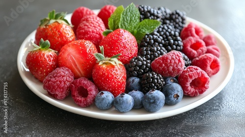 Fresh Berries Mix Red Raspberries Blackberries Blueberries Strawberries on White Plate
