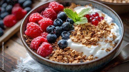 Fresh Berry Yogurt Bowl with Granola and Mint Garnish
