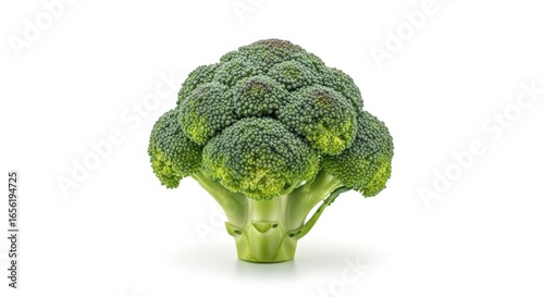 Fresh broccoli head, vibrant green, isolated on white background.