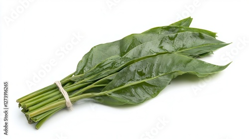 Fresh bunch of vibrant spinach leaves arranged neatly on a clean white surface, showcasing their rich green color and healthy appearance.