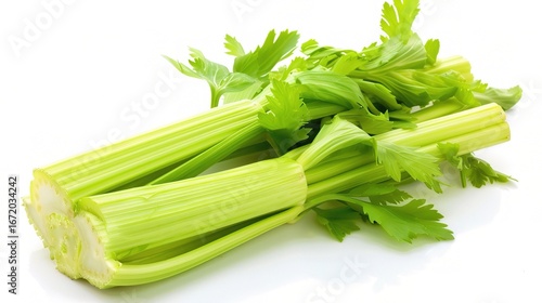 Fresh celery stalks with crisp green stems and leafy tops, bundled together or placed loose on a white marble countertop, with a small bowl of hummus for dipping nearby, under bright natural light.