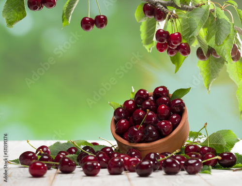 Fresh cherries in pots on the table in the cherry orchard. Sun eaves over cherries. Organic food concept for natural food and healthy life