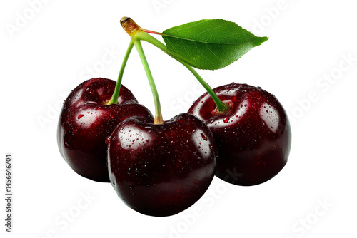 Fresh cherries with droplets on transparent background