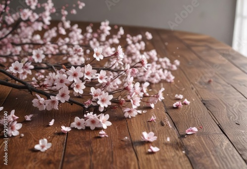 Fresh cherry blossoms scattered on a wooden table, fresh cherry blossoms, still life