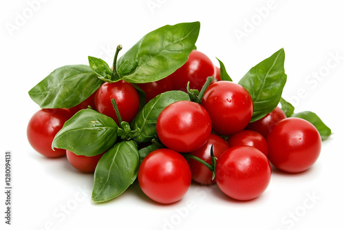 Fresh cherry tomatoes and basil leaves isolated on white background