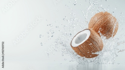 Fresh coconuts and water splashes in mid-air, clean minimalist white background, tropical energy