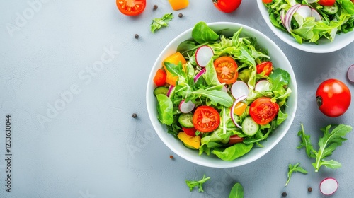 Fresh Colorful Salad with Cherry Tomatoes, Radishes, Cucumbers, and Leafy Greens on a Light Gray Background