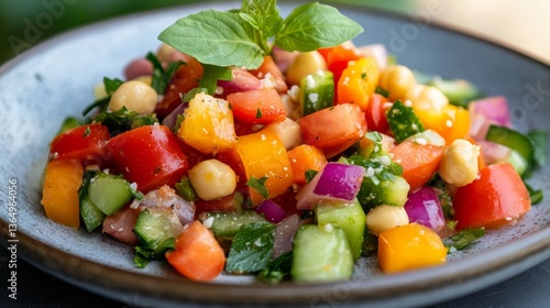 Fresh Colorful Vegetable Salad with Cucumber Tomato and Bell Pepper on Ceramic Plate