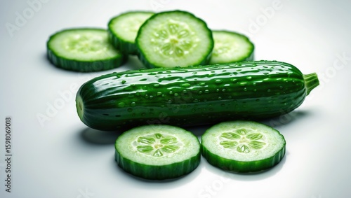 Fresh cucumber with slices and water droplets, healthy vegetable snack, natural food ingredient, chilled and refreshing.