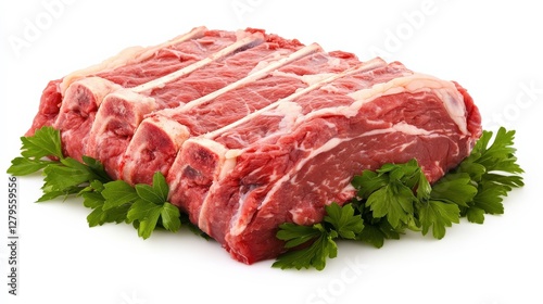 Fresh cuts of beef ribs displayed on a bed of parsley, highlighting quality for culinary use