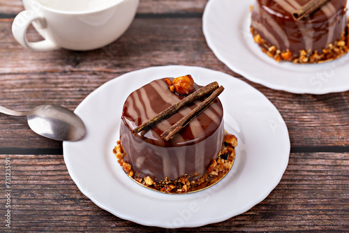 Fresh delicious chocolate souffle cake on white plate on wooden background. Caramel glaze and decoration add appeal and desire