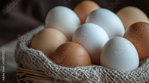 "Fresh Eggs in a Basket: A Variety of Brown and White Eggs Arranged Neatly in a Woven Basket, Perfect for Farm-Fresh Cooking"