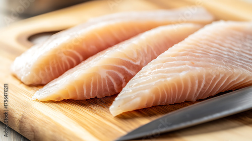 Fresh fillets of white fish rest on a wooden cutting board, ready to be prepared for a healthy meal. The knife hints at culinary preparation.