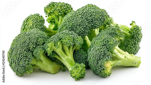Fresh Green Broccoli Heads Piled Together on a White Surface for Healthy Eating and Nutrition Concept, Displaying Vibrant Colors and Natural Texture