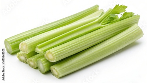Fresh green celery stalks stacked together on a white background