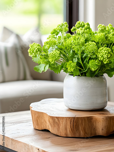 flower, green, vase, bowl, ceramic, wooden, platter, table, home, decor, interior, design, living, room, modern, farmhouse, rustic, natural, plant, arrangement, display, centrepiece, fresh, spring, summer, autumn, foliage, bouquet, lighting, cosy, elegant, simple, neutral, calm, peaceful, dining, hot drink, stylish, minimalist, accent, texture, furniture