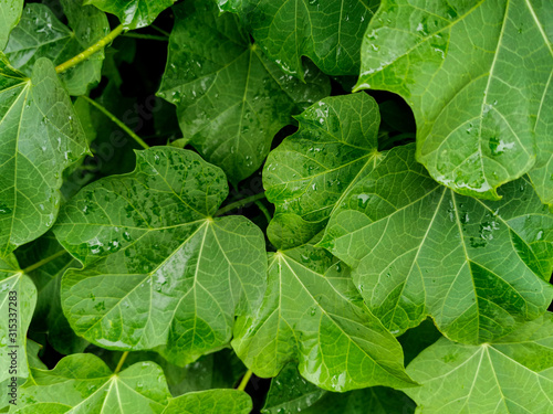 Fresh green foliage with water drops after rain. Beautiful Jatropha curcas plants in closeup