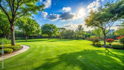 Fresh green lawn in outdoor nature setting, perfect for landscaping and parking areas with copy space
