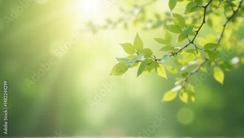Fresh green leaves on a delicate branch stretch into soft sunlight with a vibrant green bokeh background, evoking a peaceful and refreshing nature scene. Generative, AI,