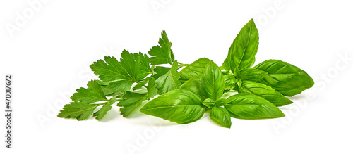 Fresh green parsley leaf with basil leaf, isolated on white background.