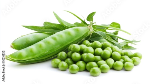 Fresh green pea pod with peas and leaves arranged on a white background showcasing vibrant color and natural freshness.