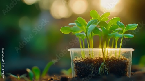Fresh Green Seedlings Growing in a Transparent Container on a Bright Sunny Day