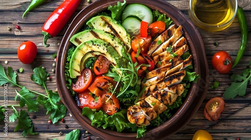 Fresh Grilled Chicken Salad with Avocado, Cherry Tomatoes, and Colorful Vegetables on Rustic Wooden Table