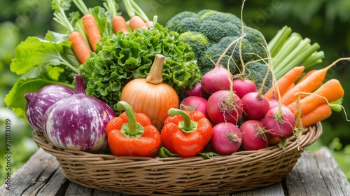 Fresh harvest of seasonal vegetables in a woven basket on a wooden table surrounded by greenery