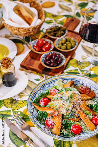 bowl, epicure, lunch, bread, diet, crispy, plate, organic, delicious, red wine, glasses, lettuce, meal, leaf, fresh, cheese, salad, red, wine, dish, healthy, food, vegetable, classic, parmesan, crouton, ingredient, snack, macro, green, tasty, olive, dressing, nourishment, background, utensil, cookery, table, alcohol, white, caesar, drink, grilled, italy