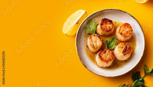 Fresh healthy seared scallops on yellow background