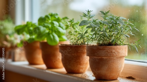 fresh, herb, terracotta, pot, green, plant, window sill, sunny, natural, organic, healthy, aromatic, fragrant, spice, herb, small, gardening, kitchen, cooking, ingredient, culinary, homegrown, indoor, growing, basil, parsley, thyme, closeup, closeup, photo, rosemary, agriculture, sustainable, local, day, bright, light, wholesome, nourishment, favor, seasoning, potted, container