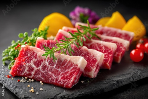 Fresh High-Quality Marbled Beef Steaks Arranged on Black Slate Serving Platter Garnished with Herbs and Vegetables for Gourmet Cuisine