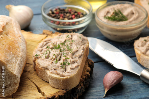 Fresh homemade chicken liver pate with herbs on bread on a blue wooden table. A sandwich. close-up
