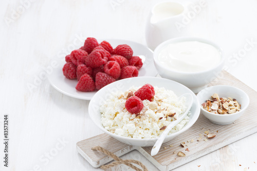 fresh homemade cottage cheese with raspberry, milk and yogurt