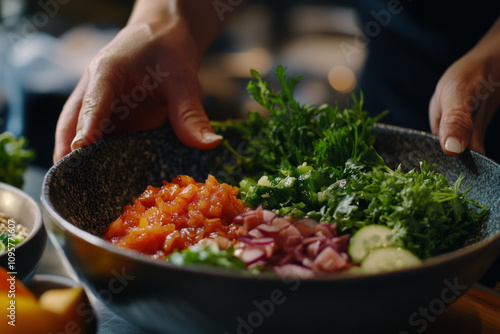 Fresh ingredients being arranged in bowl, showcasing vibrant colors and textures. hands skillfully mix tomatoes, cucumbers, onions, and greens, creating healthy salad