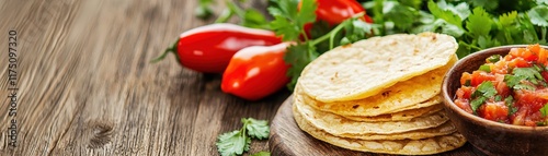 Fresh Ingredients for Tacos with Tortillas, Salsa, and Vegetables on Wooden Background