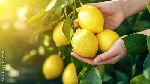 Fresh lemons harvested from a tree, showcasing vibrant yellow color and healthy leaves in bright sunlight.