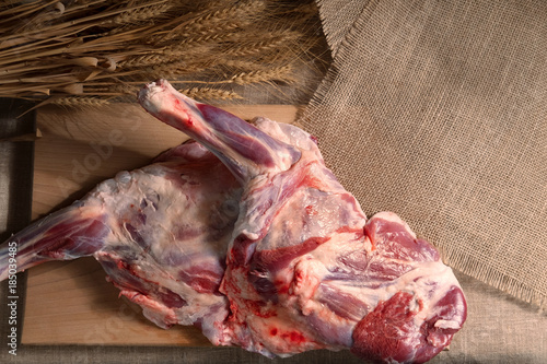fresh meat, a leg of mutton on a cutting Board on a background of linen burlap