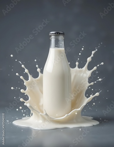 Fresh milk bottle exploding in a vibrant splash, showcasing creamy texture and healthy dairy goodness