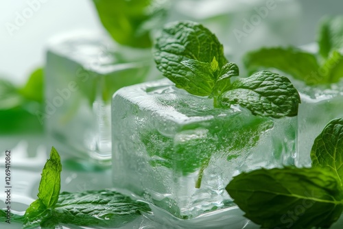 Fresh Mint Leaves on Ice Cubes with Soft Natural Light Effect