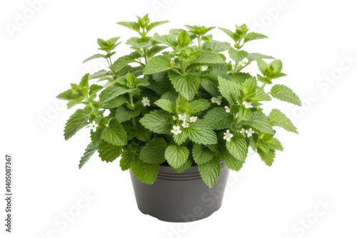 Fresh mint plant with green leaves and small white flowers in a black pot for culinary and decorative use