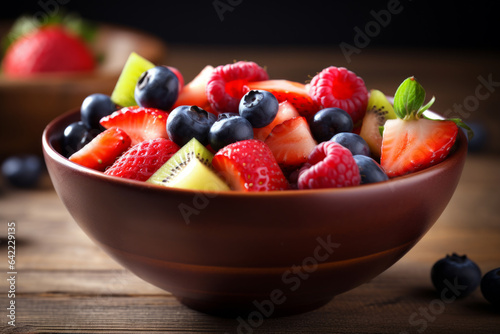 fresh mixed berries and fruit salad in bowl on top of wooden table