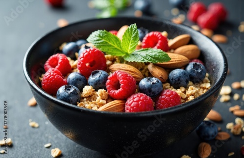 Fresh mixed berries with almonds and granola in a black bowl on a dark surface