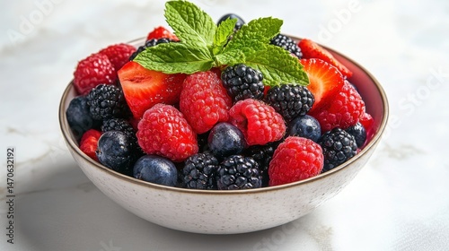 Fresh mixed berry bowl with strawberry, raspberry, and mint leaf