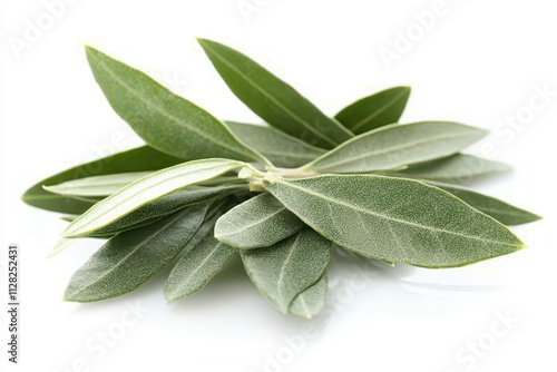 Fresh olive leaves on white background. Illustrates health, nature, and Mediterranean cuisine.