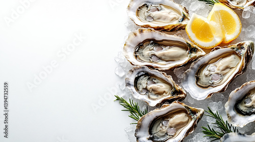 Fresh Open Oysters on Ice with Lemon Slices and Rosemary