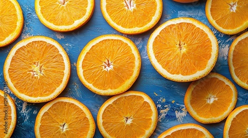 Fresh orange slices on vibrant blue surface for healthy citrus appeal