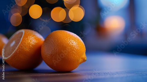 Fresh oranges on a wooden table with warm, glowing Christmas lights in the background. Holiday citrus fruit concept.